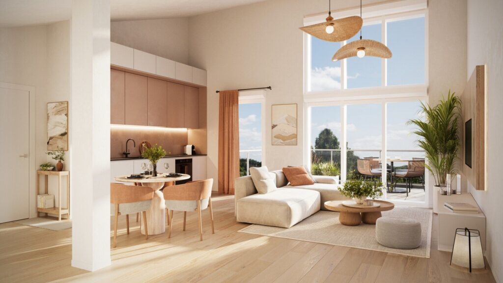 À quelques minutes du centre-ville et tout près du Grand Large, le programme immobilier neuf offre un cadre de vie paisible dans un environnement verdoyant. Située à l’angle des avenues Jean-Jaurès et Léon-Blum, la résidence profite de pistes cyclables, d’écoles accessibles à pied et des tramways T3 et T7 à 10 minutes, facilitant les trajets vers Lyon et Carré de Soie. Le Grand Large et le parc de Miribel-Jonage, proches, invitent aux loisirs nautiques et aux sorties en plein air. Une architecture intégrée et élégante. La résidence se compose de deux ambiances harmonieuses : au nord, des bâtiments contemporains aux lignes douces et aux loggias habillées de bois ; au sud, un esprit de hameau avec cinq maisons et des logements à entrées indépendantes, inspirés du paysage pavillonnaire environnant. Du 2 au 5 pièces, ainsi que des maisons duplex, les logements offrent des intérieurs lumineux, bien agencés, avec cuisines ouvertes et espaces nuit préservés. Chaque habitation dispose d’un espace extérieur privatif : balcons, loggias, terrasses jusqu’à 77 m² ou jardins jusqu’à 80 m², garantissant une véritable qualité de vie au quotidien.